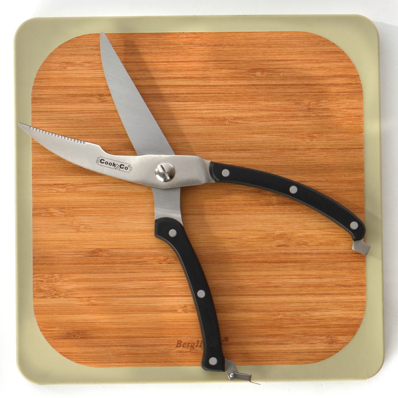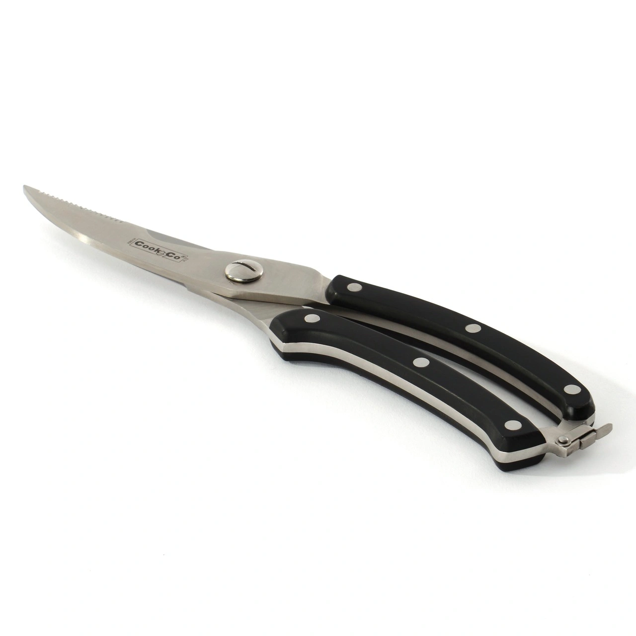 Стальные ножницы для разделки птицы и рыбы, продукция бельгийской компании BergHOFF. Черные ручки из крепкого термопластика прикреплены к металлической части заклепками. Общая длина ножниц 25 см, вес 300 г. Артикул в магазине 2800409. Мы предлагаем купить в Москве ножницы BergHOFF CooknCo для птицы и рыбы - качественный хозяйственный инструмент с гарантией от европейского производителя.