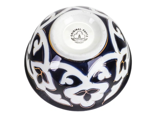Главный элемент орнамента "пахты" – цветок хлопка. Всем знакомая бело-голубая посуда с позолотой, ставшая символом восточной кухни. Этот фарфор ручной работы узбекских мастеров выглядит очень нарядно и подходит как для праздничного стола, так и для повседневного использования.