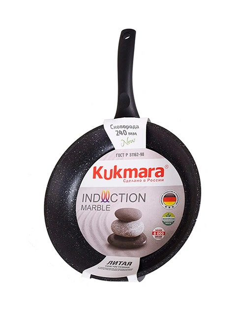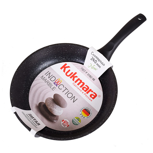 "Сковорода ""Kukmara"" изготовлена из литого алюминия и покрыта инновационным антипригарным мраморным покрытием нового поколения на водной основе, усиленным сверхтвердыми частицами минералов.