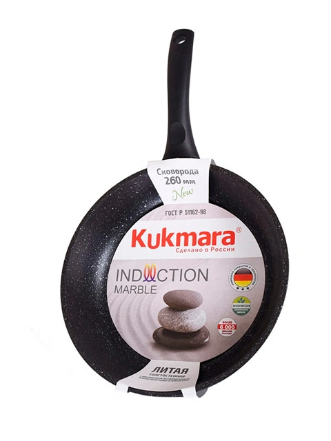 Антипригарная сковорода Kukmara имеет артикул смти260а. Диаметр сковороды 26 см, высота 6 см, вес около 1,24 кг. Сковорода снабжена стойким антипригарным покрытием, произведенным в Германии. Ненагревающаяся ручка с эффектом soft touch обработана мягким пластиком. Заказать с доставкой или купить в Москве сковороду с антипригарным покрытием Kukmara (Marble Induction темный мрамор) вы можете в магазине Plover.