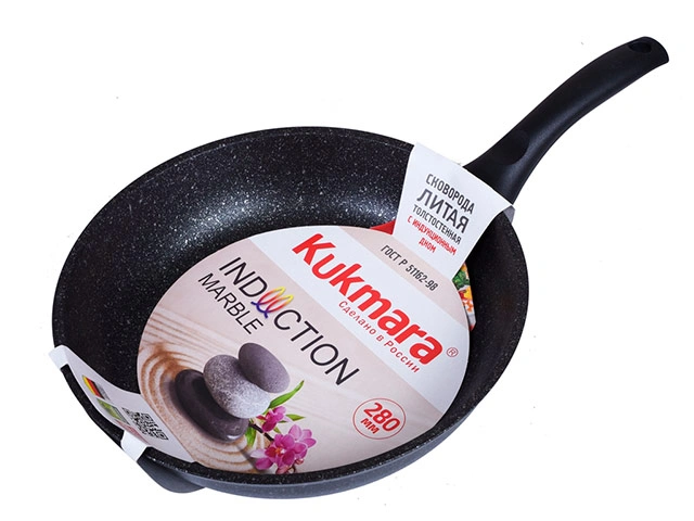 Сковорода диаметром 28 см и весом 1,52 кг произведена российской компанией Kukmara. Артикул товара смти280а. Как следует из названия серии, посуда Marble Induction подходит для индукционных плит и снабжена антипригарным покрытием, по прочности сравнимым с природным камнем. Купить в Москве сковороду с антипригарным покрытием Kukmara (Marble Induction темный мрамор) можно в разделе каталога "Посуда для индукционных плит", сковороды и кастрюли с индукционным дном отмечены узнаваемыми значками.