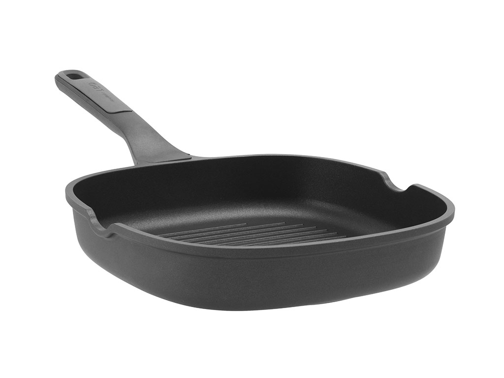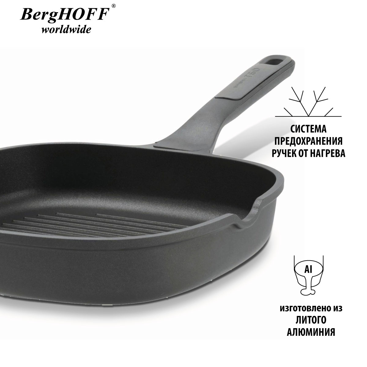 От обычной сковороды сковороду-гриль отличают толстое дно, наличие желобов для слива жира и ребристое дно, благодаря которому жир остается на дне посуды и не пропитывает готовящиеся продукты. Квадратная сковорода считается самой вместительной, на ней удобно размещать куски мяса любой формы. Многослойное антипригарное покрытие позволяет готовить в сковороде BergHOFF на минимальном количестве масла. Сковорода подходит для всех видов конфорок, в том числе индукционных.