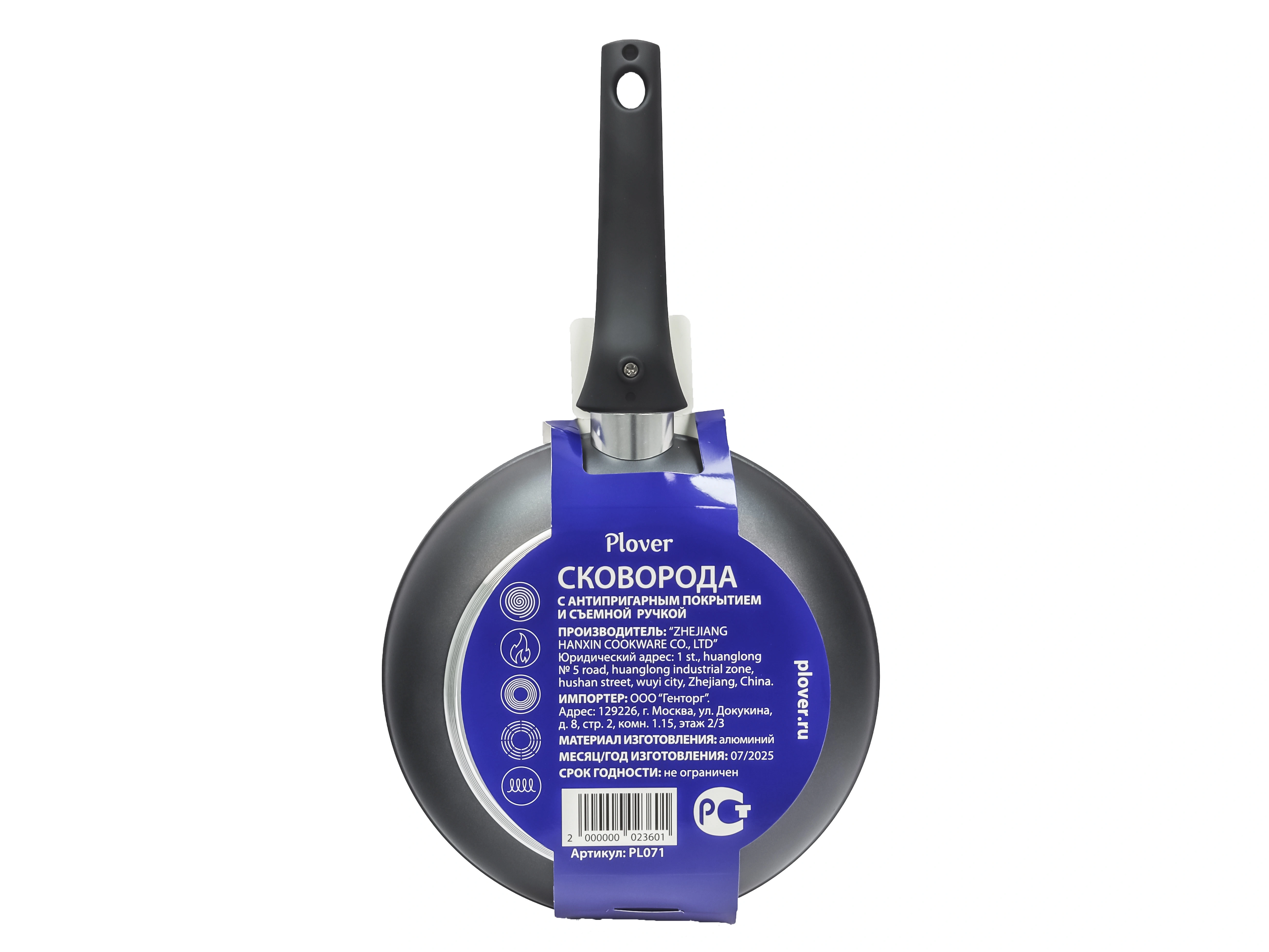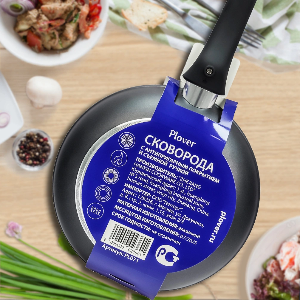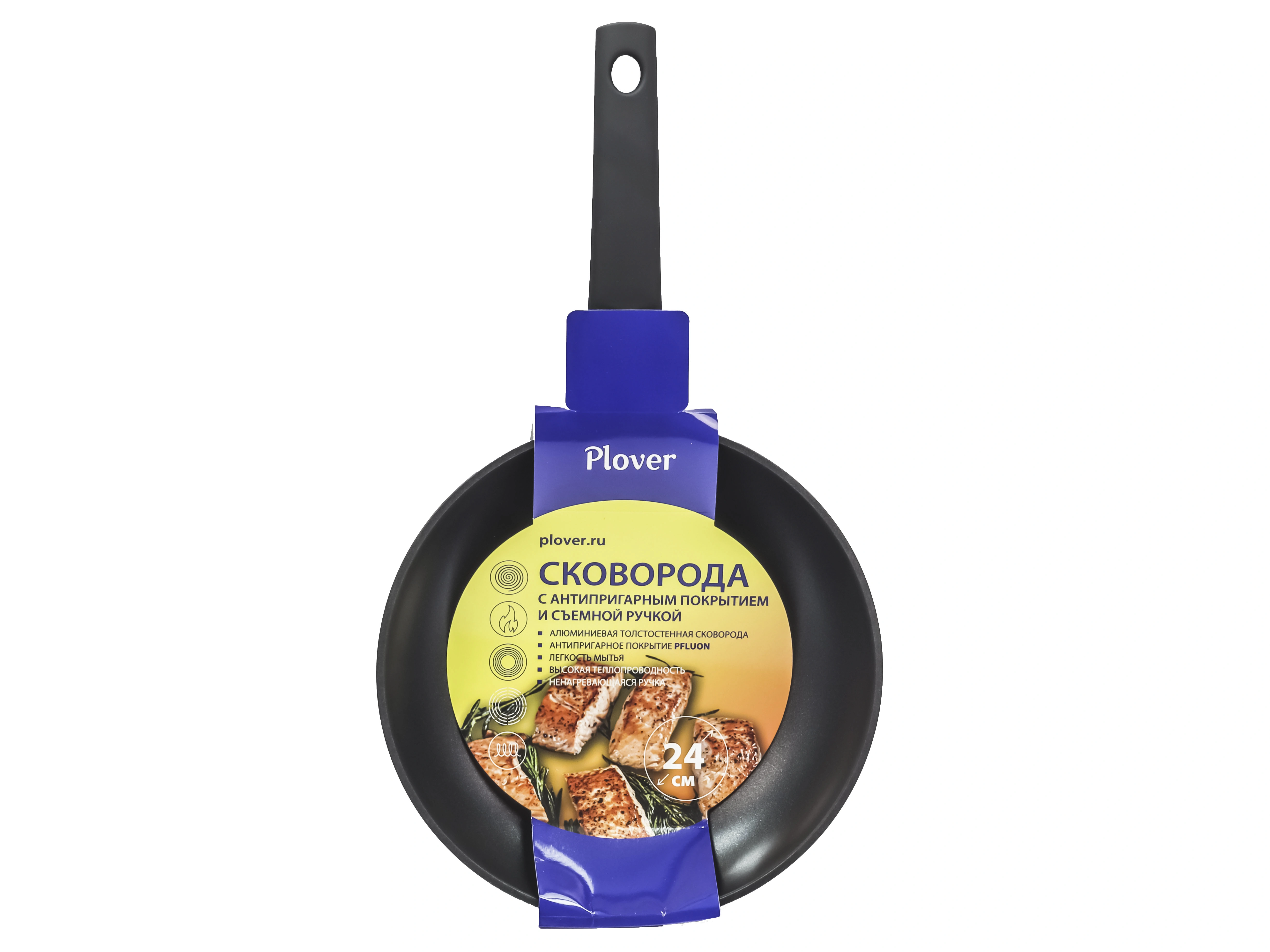 Сковорода из кованого алюминия марки Plover, страна производства Китай. Артикул в магазине PL071. Диаметр сковороды 24 см, диаметр дна 18 см, высота 5 см, вес 0,8 кг. Купить в Москве сковороду с антипригарным покрытием со съемной ручкой PLOVER, 24 см, вы можете самостоятельно или через наших операторов.