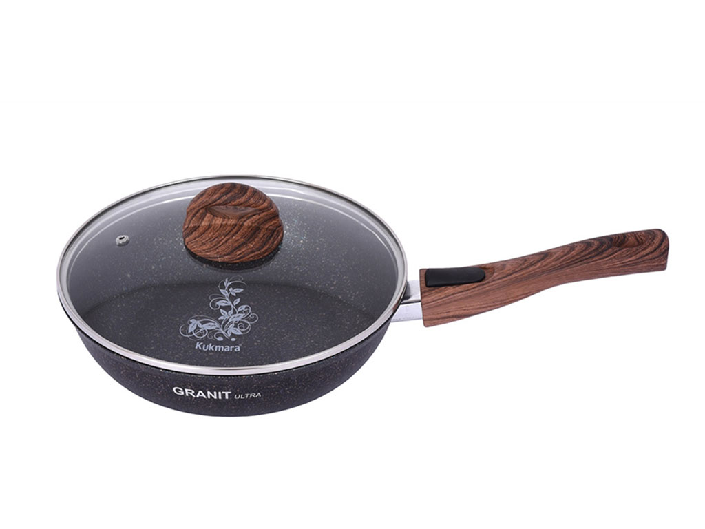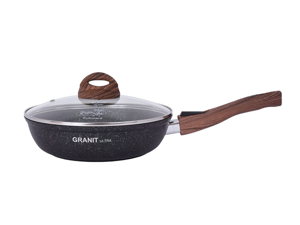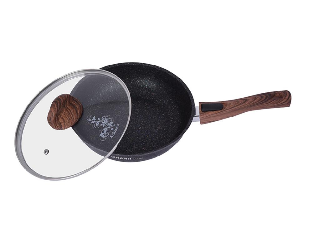 Сковорода из литого алюминия российского бренда Kukmara. Артикул товара сгг243а. Диаметр сковороды 24 см, высота 6 см, вес 1,9 кг. Толщина стенок 6 мм, это один из самых толстостенных видов посуды в ассортименте марки Кукмара. Сковорода покрыта суперстойким антипригарным напылением Granit Ultra. Ненагревающаяся съемная бакелитовая ручка оформлена под натуральное дерево. В комплекте стеклянная крышка. Купить в Москве сковороду с антипригарным покрытием со стеклянной крышкой Kukmara (Granit Ultra Blue) сгг243а, 24 см, у нас вы можете с гарантией от производителя