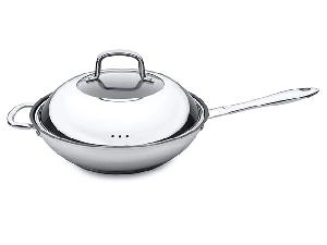 Вок — азиатская сковорода со сферическим дном и высокими стенками. Он быстро раскаляется и так же быстро отдает тепло. Форма позволяет создать на поверхности вока сразу несколько температурных режимов: внизу, на самом сильном жаре, готовится мясо, а выше, в менее жаркой зоне, овощи — вок доводит их до готовности, но не пережаривает. Сковорода подходит для всех видов конфорок, в том числе индукционных. В комплекте крышка с отверстиями для слива жидкости.