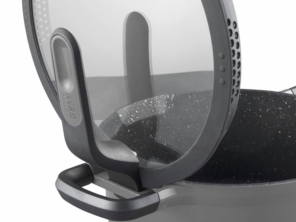 Серия Gem grey — посуда премиального качества. Весь ее внешний вид говорит, что перед нами что-то высокотехнологичное. Снаружи посуда покрыта напылением элегантных оттенков, а внутри — уникальным антипригарным покрытием Ferno Green. Многослойное покрытие не содержит вредных перфтороктановых кислот, кадмия и свинца. Оно идеально гладкое и чрезвычайно прочное. Высокая устойчивость к износу, трению и образованию царапин продлевает срок службы посуды. Дно оптимально для всех видов плит, в том числе индукционных. Стеклянная крышка сотейника с силиконовым ободком оборудована удобной ненагревающейся ручкой, носиком и отверстиями разного диаметра для слива жидкости и выхода пара. Крышку можно установить на корпусе сотейника вертикально, чтобы освободить руки.