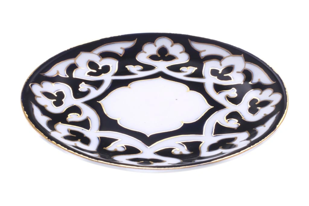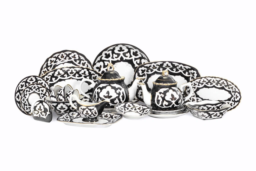 Главный элемент орнамента "пахты" – цветок хлопка. Всем знакомая бело-голубая посуда с позолотой, ставшая символом восточной кухни. Этот фарфор ручной работы узбекских мастеров выглядит очень нарядно и подходит как для праздничного стола, так и для повседневного использования.