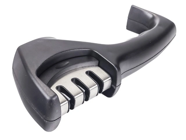 Инструмент предназначен для заточки и полировки ножей. Благодаря ступенчатой конструкции, работа с лезвием происходит в три этапа. Первый желоб с алмазной поверхностью готовит нож к заточке, второй желоб затачивает режущую кромку, третий желоб со вставкой из керамического камня окончательно полирует лезвие и доводит до совершенства, убирая неровности. Большая ручка точилки удобно ложится в руку, нескользящее основание придает инструменту устойчивость в процессе работы.