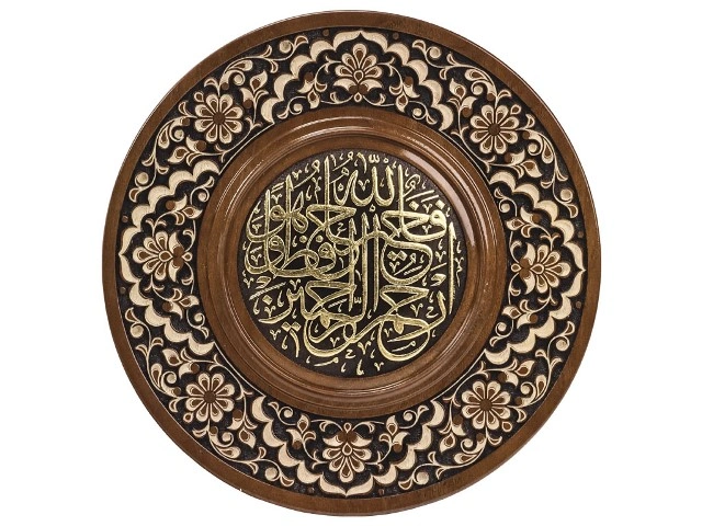 Деревянное панно ручной работы с сурой из Корана.Выполнено из благородного сорта грецкого ореха. Древисину сушат от 5 до 6 лет при определенных условиях. Декорировано золочением. Диаметр панно - 25 см. Авторская работа узбекского мастера-резчика по дереву Шухрата Ахмедназарова.