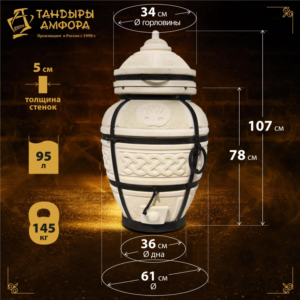 Тандыр среднего размера. Объем 95 л (рассчитан на 5-6 кг мяса и 12-14 персон), толщина стенки 6 см (+/-0.5 см), высота 107 см, высота без крышки 78 см, диаметр 61 см, внутренний диаметр горловины 33-34 см, внешний диаметр дна 36 см, вес 146 кг (+/- 5 кг). В комплект входят 12 шампуров (длина рабочей части 46.5 см, общая длина 56 см), кочерга, совок, колосник d22, приспособление для подвешивания шампуров. Артикул товара в магазине AM105. Купить тандыр “Атаман” на нашем сайте вы можете в один клик.