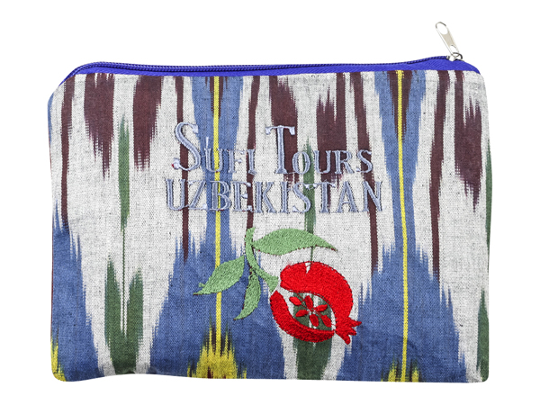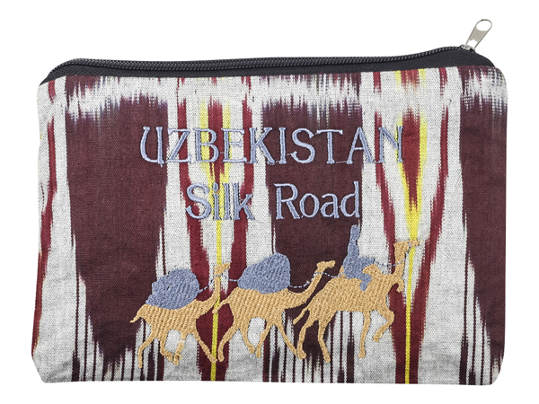 Кошелек с застежкой-молнией из натуральной ткани "адрас" (100% хлопок) с машинной вышивкой. Сюжет напоминает об истории Узбекистана, города которого располагались на Великом Шелковом пути. Отличный подарок или сувенир.