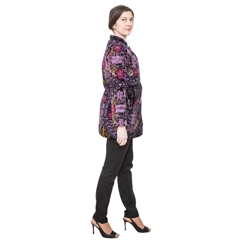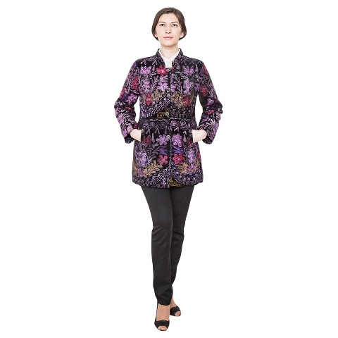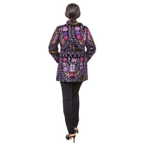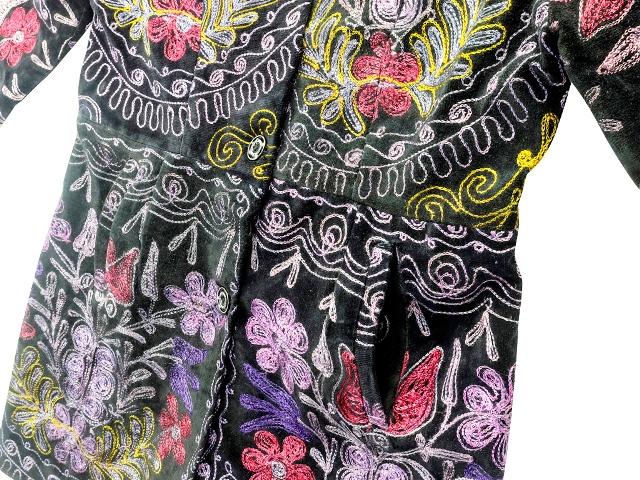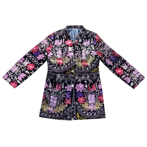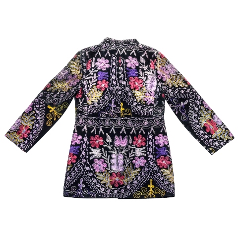Очень нарядный женский пиджак, покрытый ручной вышивкой на черном фоне. Сочетается как с другими традиционными вещами, так и с современной повседневной одеждой.