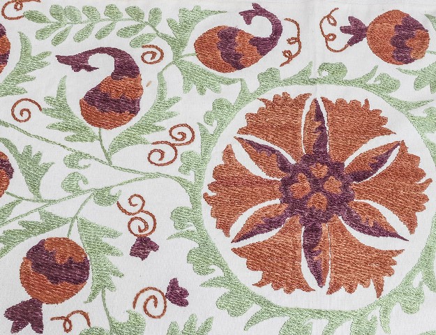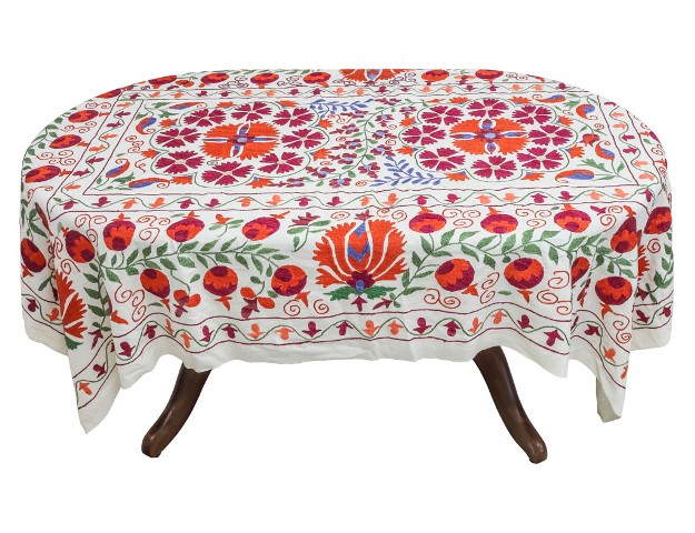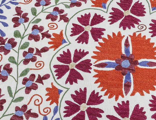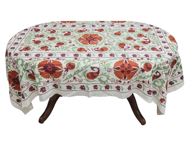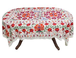 Основа скатерти - 100% узбекский хлопок; с традиционной узбекской вышивкой "Сюзане", вышивка выполнена вискозно-шелковыми нитями.В концепции узора, вышитого на полотне, лежит растительная тема, в виде цветущего сада.