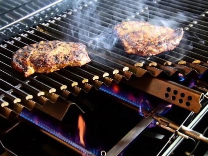 Хорошо, если наряду с классическими газовыми имеется инфракрасная горелка. Она дает сильный жар, готовит быстрее, нагревает продукты напрямую, карамелизует их и обеспечивает хрустящую корочку, сохраняя сочность. Из-за своей интенсивности инфракрасная горелка подходит не для всех блюд, например, не годится для копчения или приготовления рыбы, но хороша для стейка.