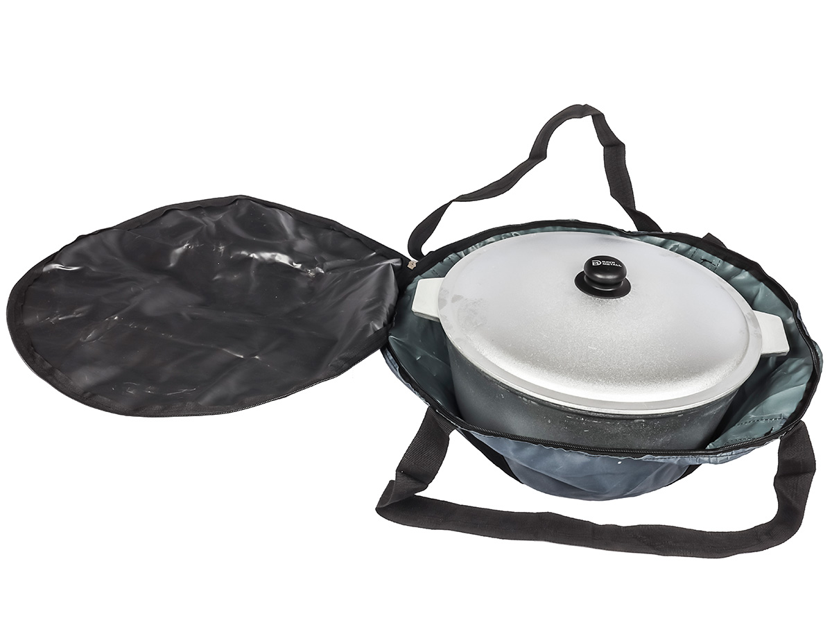 Этот чехол закрывается на молнию и оснащён удобными ручками для переноски, что делает его идеальным для хранения и транспортировки казана. Он также подходит для сопутствующих принадлежностей, таких как шумовка, половник и посуда.