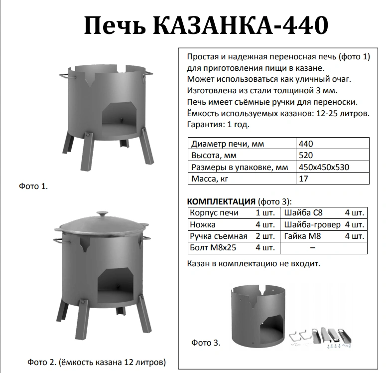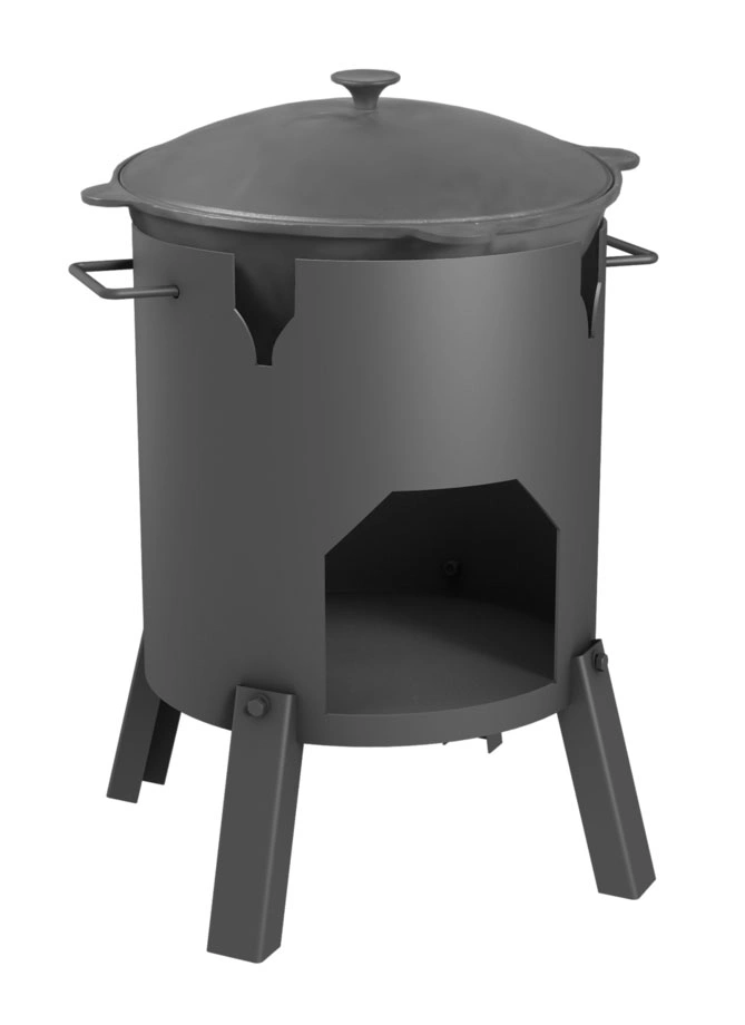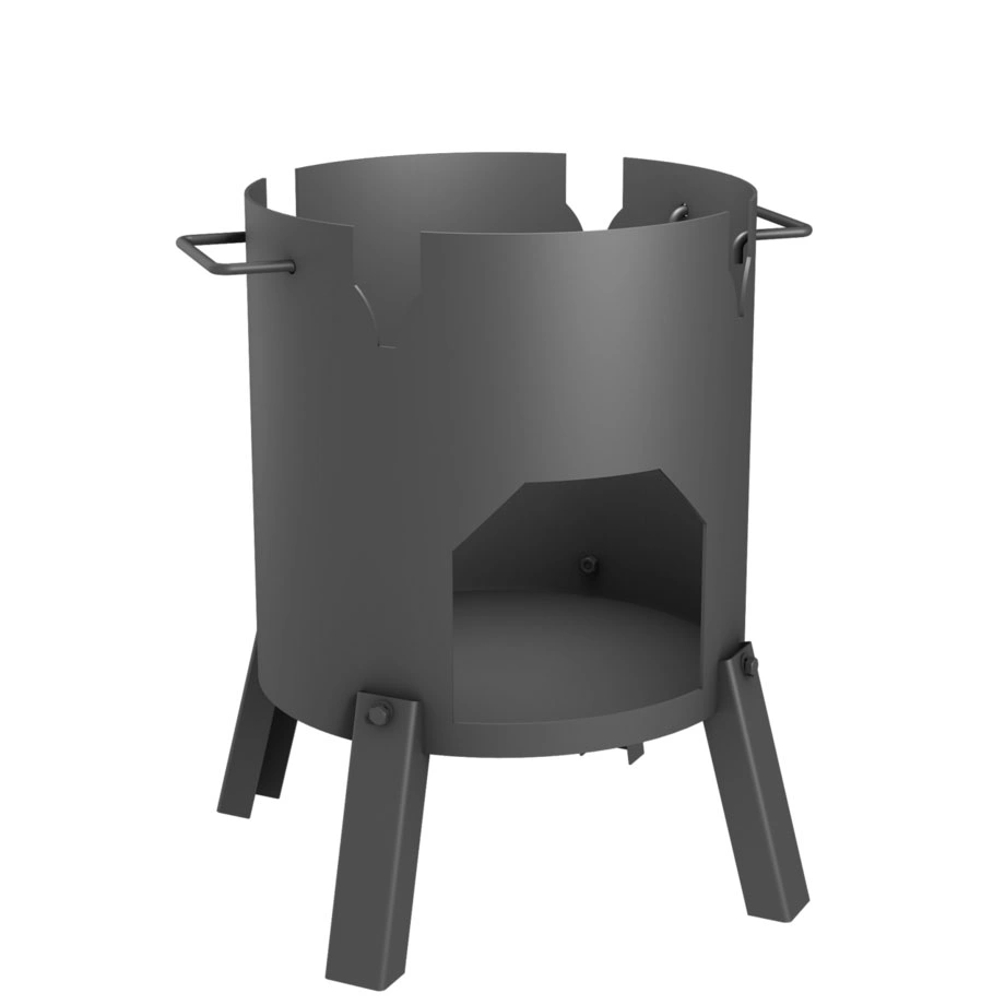 Простая и надежная переносная печь для приготовления пищи на казане. Может использоваться как уличный очаг. Изготовлена из стали толщиной 3 мм. Печь имеет съемные ручки для переноски. Емкость используемых казанов: 12-25 литров.