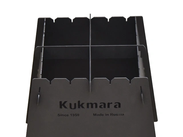 Благодаря разборной печи Kukmara приготовление пищи в походе будет приносить одно удовольствие. Конструкция прочная и устойчивая, легко и быстро собирается. Форма печи сужающаяся. Жар поднимается вверх и концентрируется на одном месте. В боковых стенках есть отверстия, выполняющие роль поддувала. Материал печи - сталь, толщина которой 2 мм.