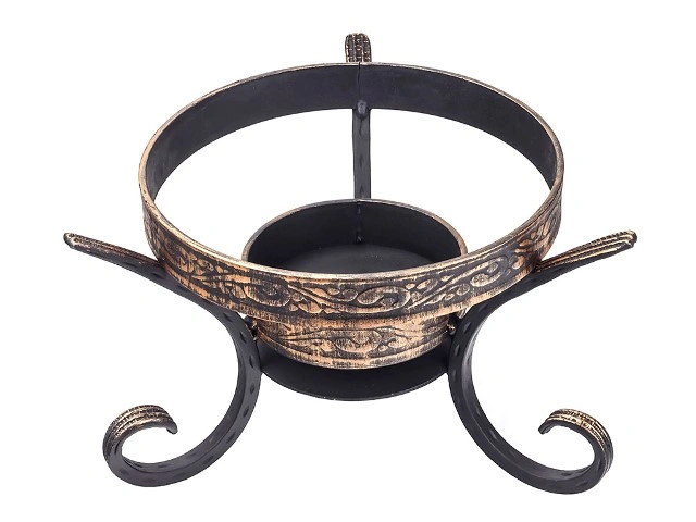 Кованая подставка позволяет красиво подать на стол садж с мясом и овощным гарниром. В емкость помещается нагревающий компонент, поддерживающий температуру сковороды и ее содержимого — угли, свеча, спиртовая горелка, мармитное топливо. Температуру нагрева можно регулировать: пламя свечи поддерживает теплый режим, горелка или угли — горячий. Обратите внимание, что размер подставки зависит от размера сковороды. Эта подставка идеально подходит для саджа диаметром 30-40 см, а также для казана объемом 8-16 литров.