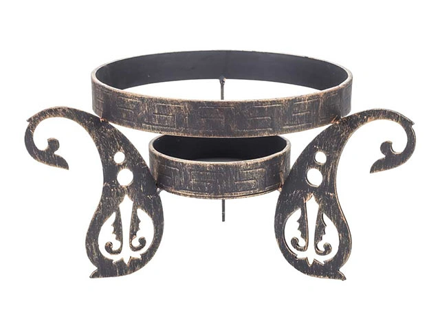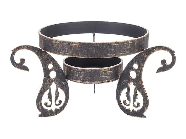 Кованая подставка позволяет красиво подать на стол садж с мясом и овощным гарниром. В емкость помещается нагревающий компонент, поддерживающий температуру сковороды и ее содержимого — угли, свеча, спиртовая горелка, мармитное топливо. Температуру нагрева можно регулировать: пламя свечи поддерживает теплый режим, горелка или угли — горячий. Обратите внимание, что размер подставки зависит от размера сковороды. Эта подставка идеально подходит для саджа диаметром 30-40 см, а также для казана объемом 8-12 литров.
