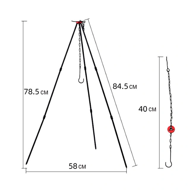 Приспособление для подвешивания над костром котла или казана, продукция российской марки PLOVER, страна производства Китай. Длина ножек 84,5 см, диаметр 8 мм, длина подвеса с крючком 40 см. Общая высота треноги в собранном виде 78,5 см, в сложенном - 28 см. Артикул товара PL023. Купить треногу для костра разборную, 78,5х58 см, в Москве или другом городе вы можете на нашем сайте.