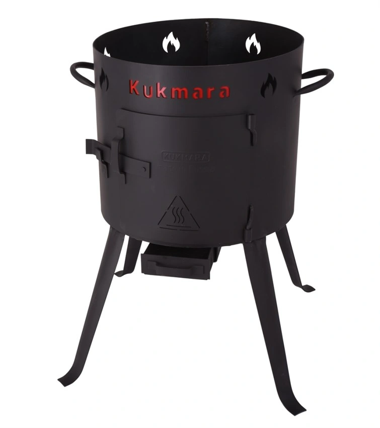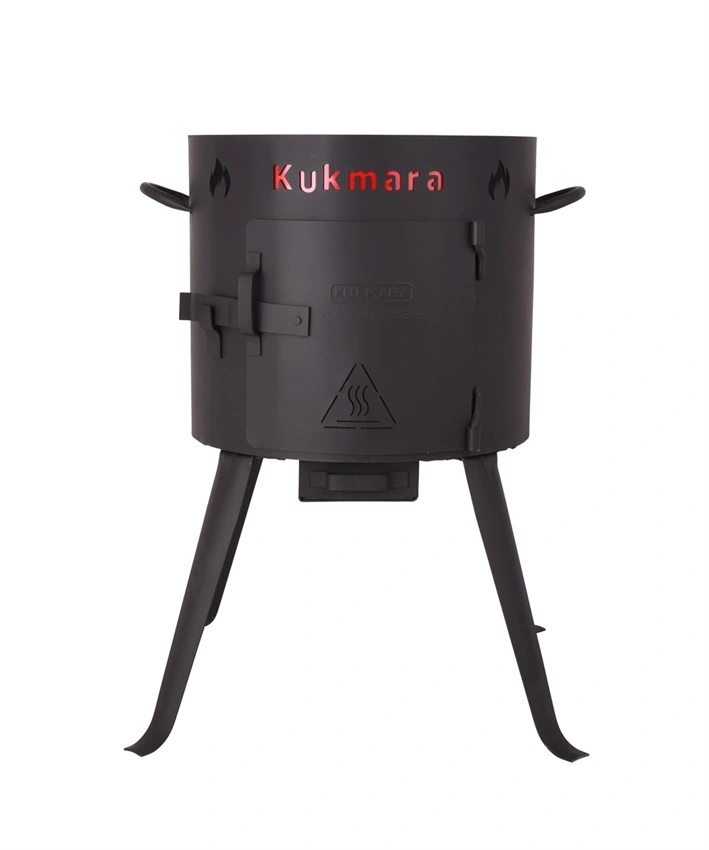 Учаг безопасен, ведь огонь разжигается внутри печи. Зато жар от огня и углей отлично прогревает установленный сверху казан или котел. Дымоотводящие отверстия, распределенные по всему корпусу, обеспечивают равномерный нагрев. Колосники защищают дно от деформации и прогорания. Еда на учаге готовится быстрее, чем на открытом огне, и дров требуется меньше. Благодаря съемным ножкам, учаг легко перевозить и устанавливать.