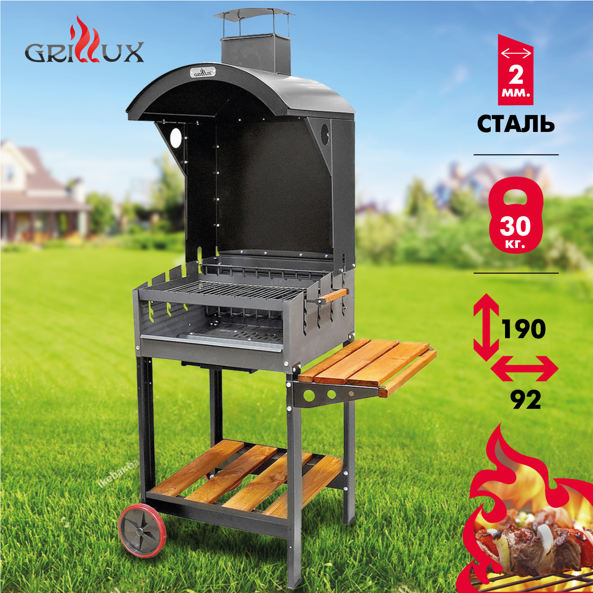 Данная модель гриля позволяет регулировать высоту решетки для шампуров и мангала (всего 4 позиции), что делает эксплуатацию максимально комфортной. Материал, из которого изготовлено изделие, обеспечит максимальную длительность эксплуатации, при любых погодных условиях в любое время года.