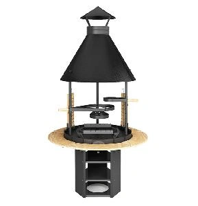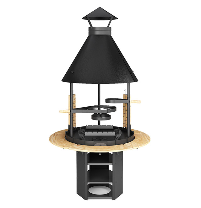 Стальная конструкция покрыта защитным слоем огнеупорной краски. Круглый очаг закрыт от непогоды цилиндрическим куполом с дымоходом. На стойках из нержавеющей стали закреплены регулируемые подставки, положение которых можно менять в процессе готовки. Шашлычный модуль легко устанавливать и снимать. В комплекте предусмотрена ольховая доска для копчения. На нижних полках размещают дрова или мешки с углем. Инструменты, закуски и бокалы можно расположить на подвесных столиках, создающих единую столешницу вокруг очага. Для чистки очага предусмотрен выдвижной зольник.