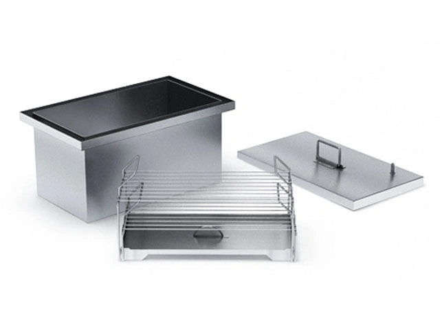 Smoky Boom – коптильня, которая выполнена из стали толщиной 1,5мм. Короб закрывается крышкой с гидрозатвором, который обеспечивает герметичность емкости и предупреждает возгорание щепы. Внутри есть двухъярусный стеллаж для продуктов. На крышке установлен штуцер с обратным клапаном для отвода газов.