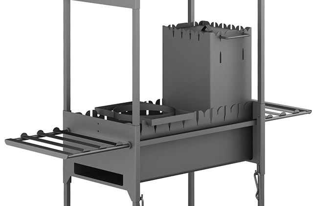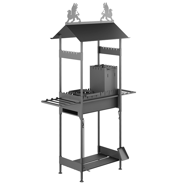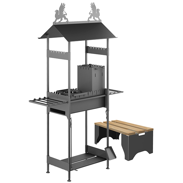 Оригинальная, стильная стационарная модель с продуманной эргономикой. Два уровня установки шампуров - для дров и для угля. Специальные прорези на боковых стенках обеспечивают фиксацию поворота шампура (при наличии "спирали" на шампуре). Мангал оснащён съёмными боковыми столиками. В "башне" можно приготовить угли из дров. Крышка башни служит для снижения интенсивности горения дров. Накладное кольцо под казан устанавливается в прорези для шампуров. Внизу располагаются металлические полки. Функциональная скамья-обрешётка служит дополнительной защитой мангала при транспортировке. Далее используется как обычная скамья.