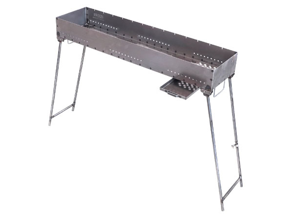 Легкий, компактный, быстро собирающийся мангал классической конструкции представляет собой стальной короб со складными ножками. Наличие ребер жесткости придают мангалу дополнительную прочность, оптимальная толщина исключает деформацию стенок от жара углей. Воздух, обеспечивающий равномерное горение, поступает через отверстия в стенках мангала. Пазы на боковине позволяют установить шампуры в нужном положении. Для образующейся золы предусмотрен зольник.