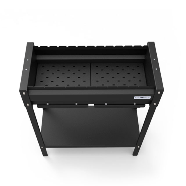 Мангал с двухзонной жаровней с поддувалами - 2-мя отдельными заменяемыми перфорированными днищами и 2-мя зольными ящиками - с возможностью раздельного регулирования интенсивности горения углей по полю жаровни.