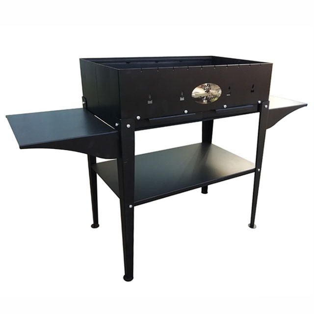 Мангал стальной с двумя боковыми столиками и нижней полкой.