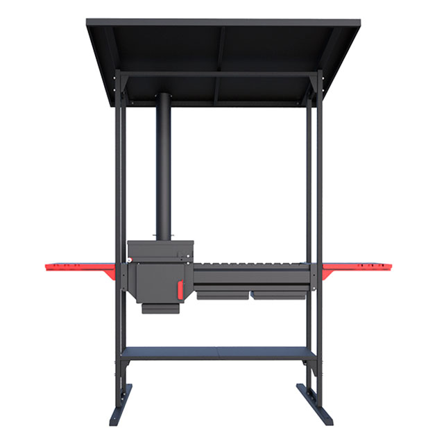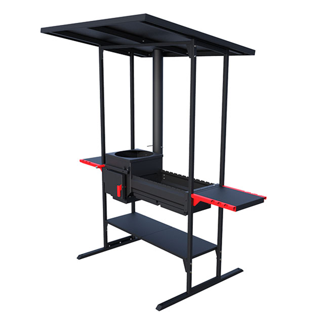 Печь-мангала оснащена навесом и прикрепленными к нему боковыми столиками. Опоры снизу придают устойчивость обвязке. Термостойкое покрытие конструкции выдерживает до +700°С.