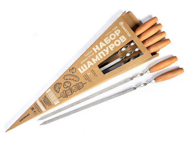 Шампуры сделаны из высококачественной стали, ручки — из ценных пород дерева (бук, дуб). Основание в виде спирали обеспечивает разворот шампура в пазах мангала, заостренное окончание позволяет нанизывать кусочки продуктов, не повредив их. Шампуры подходят ко всем мангалам Gratar и другим моделям.