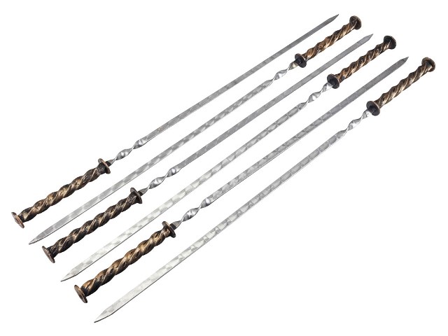 Шампуры сделаны из нержавеющей стали. Основание в виде спирали обеспечивает разворот шампура в пазах мангала, заостренное окончание позволяет нанизывать кусочки продуктов, не повредив их. После использования шампуры рекомендуется вымыть и вытереть насухо. Шампуры с коваными ручками — не только необходимый аксессуар, но и отличный подарок. Такой набор станет желанным презентом для каждого, кто любит готовить на мангале.