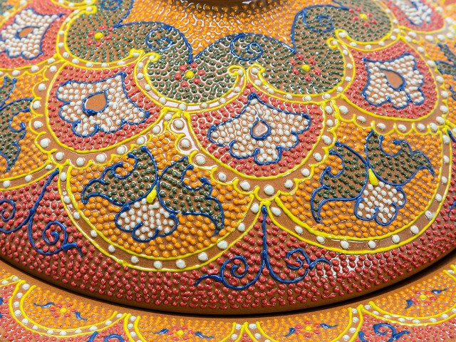 Точечная роспись - это древняя техника создания узоров, присмотритесь, орнамент на посуде состоит из объемных точек - очень кропотливая работа, занимающая много времени.
