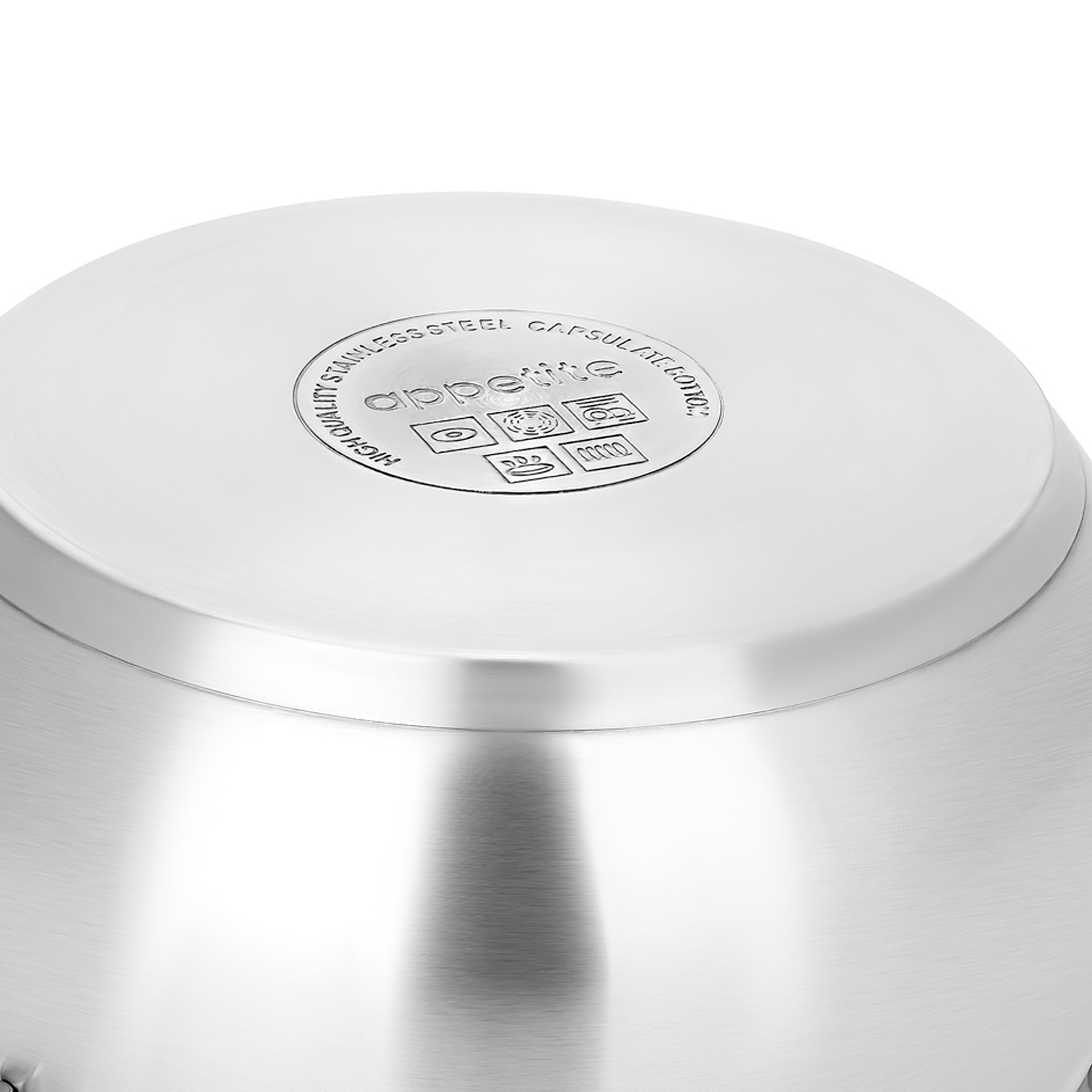 Кастрюля Appetite, изготовленная из высококачественной нержавеющей стали с матовой полировкой, имеет трехслойное термоаккумулирующее дно. Особая конструкция дна способствует высокой теплопроводности и равномерному распределению тепла. Материал удерживает тепло по всей поверхности изделия, благодаря чему пища равномерно и быстро нагревается.