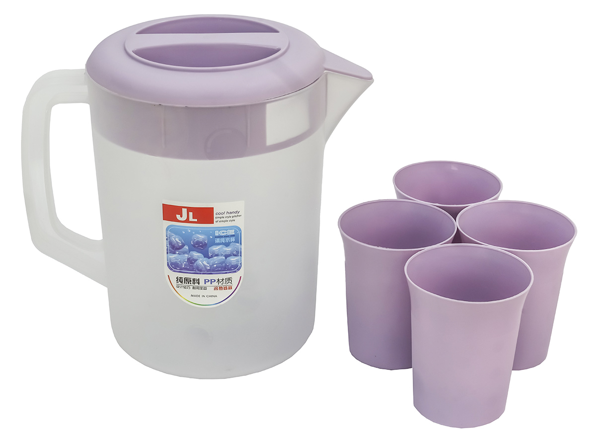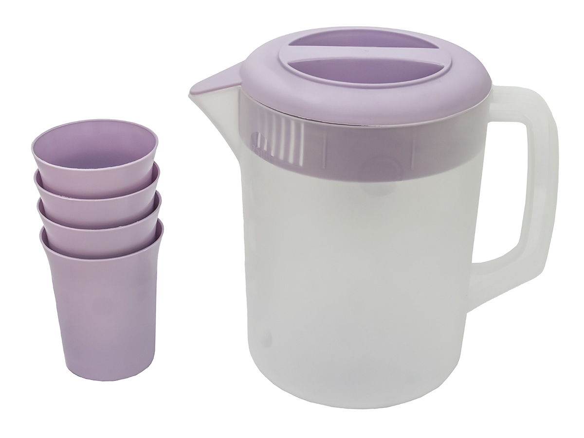 Пластиковый набор: кувшин и 4 стакана – идеальный выбор для вашей кухни, дачи или для поездок на природу! В него входит пластиковый кувшин объёмом 2.5 литра и четыре стакана по 300 мл.