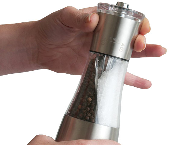 С двумя приправами в одной мельнице этот продукт – идеальный инструмент, чтобы придать пикантности всем вашим блюдам. Нет необходимости в отдельной солонке и перечнице, просто поверните мельницу по часовой стрелке, чтобы размолоть одну специю, и против часовой стрелки, чтобы размолоть другую. Благодаря регулируемому керамическому механизму помола вы можете одним движением руки выбирать мелкий или грубый помол специй. Удивительно удобный и компактный инструмент!
