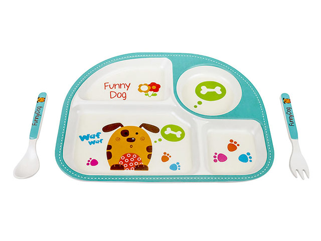 Легкая, прочная, яркая гипоаллергенная посуда из натурального материала. Бамбуковое волокно получают путем измельчения стеблей и листьев, посуду из него делают методом прессования. Бамбук выращивается без использования химических удобрений, на производстве сырье обрабатывается паром. Картинки – мотивы с собачкой – нанесены пищевыми красками, безопасными для здоровья ребенка. В отличие от стеклянной или керамической посуды, бамбуковая не разобьется и не расколется при падении. Бамбуковая посуда выдерживает частое мытье, в том числе в посудомоечной машине, но ее не рекомендуется на долгое время замачивать в воде и использовать в микроволновой печи.