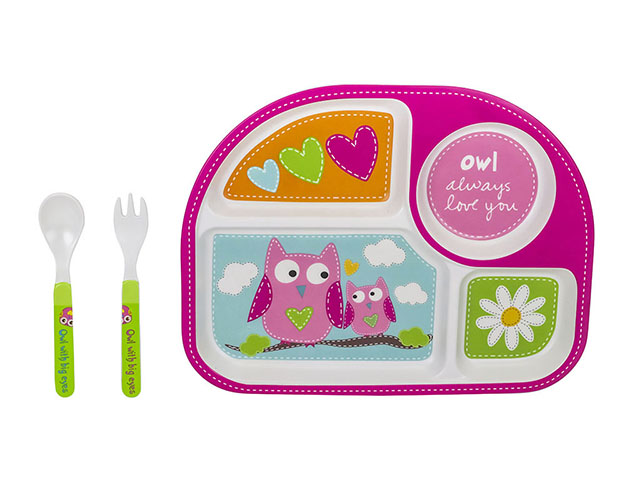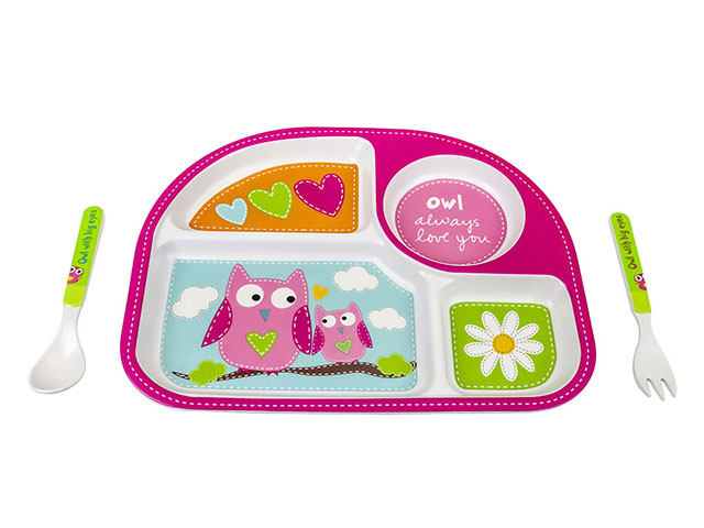 Детская посуда из бамбукового волокна, в комплекте тарелка с разделителями, ложка и вилка, рекомендовано для детей с 6 месяцев. Производитель посуды российская марка PLOVER, страна изготовления – Китай. Артикул товара PL038. Купить набор детской бамбуковой посуды для кормления "Совушка", 3 предмета, в Москве вы можете на нашем сайте в разделе “Посуда”.