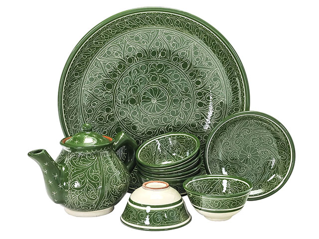Набор чайный "Риштан" зеленый, 9 предметов (ляган диаметр 32 см, чайник 0,8 л, пиалы диаметр 11 см 6 шт., тарелка диаметр 15 см)