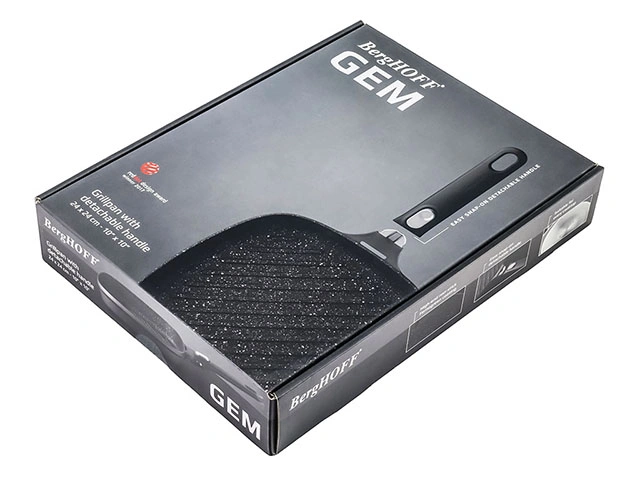 Посуда серии Gem покрыта уникальным антипригарным покрытием Ferno Green. Многослойное покрытие не содержит вредных перфтороктановых кислот, кадмия и свинца. Оно идеально гладкое и чрезвычайно прочное. Высокая устойчивость к износу, трению и образованию царапин продлевает срок службы посуды. Дно оптимально для всех видов плит, в том числе индукционных. Ненагревающаяся ручка обеспечивает безопасный и удобный захват. Она съемная, что позволяет использовать посуду в духовке и экономить место при ее хранении.