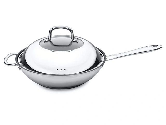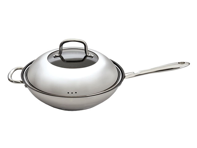 Вок — азиатская сковорода со сферическим дном и высокими стенками. Он быстро раскаляется и так же быстро отдает тепло. Форма позволяет создать на поверхности вока сразу несколько температурных режимов: внизу, на самом сильном жаре, готовится мясо, а выше, в менее жаркой зоне, овощи — вок доводит их до готовности, но не пережаривает. Сковорода подходит для всех видов конфорок, в том числе индукционных. В комплекте крышка с отверстиями для слива жидкости.