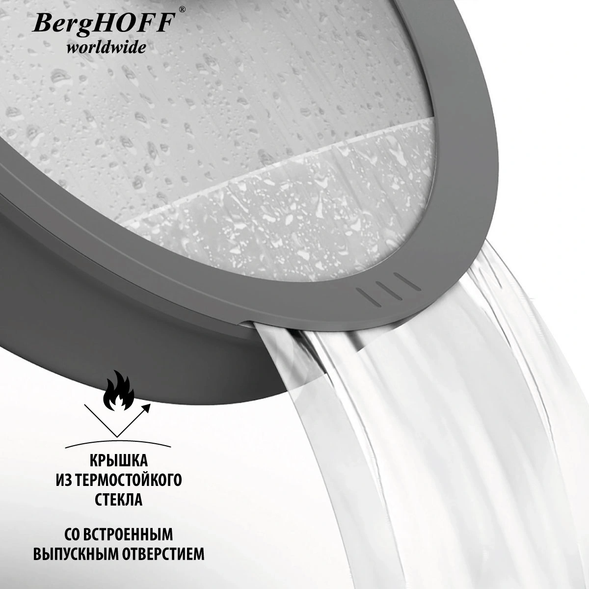 На крышке предусмотрено специальное сливное отверстие, которое поможет избавится от лишней жидкости, а благодаря ненагревающемуся силиконовому ободку крышку можно придерживать руками.