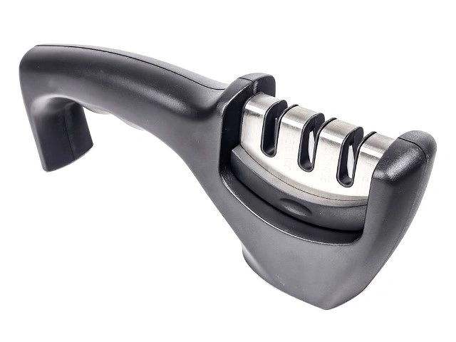 Инструмент предназначен для заточки и полировки ножей. Благодаря ступенчатой конструкции, работа с лезвием происходит в три этапа. Первый желоб с алмазной поверхностью готовит нож к заточке, второй желоб затачивает режущую кромку, третий желоб со вставкой из керамического камня окончательно полирует лезвие и доводит до совершенства, убирая неровности. Большая ручка точилки удобно ложится в руку, нескользящее основание придает инструменту устойчивость в процессе работы.