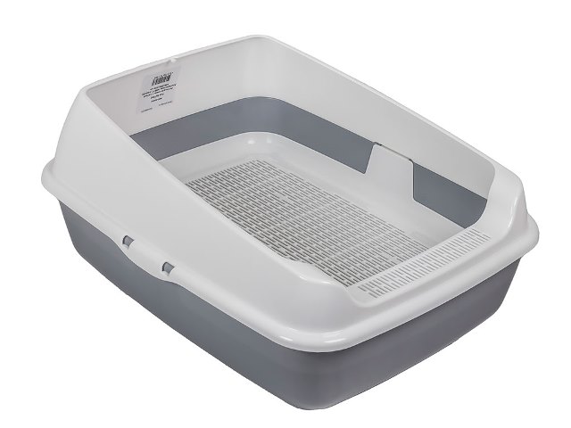 Лоток для кошек с высокими бортами и сеткой изготовлен из прочного пластика, безопасен для здоровья питомца и не имеет посторонних химических запахов.