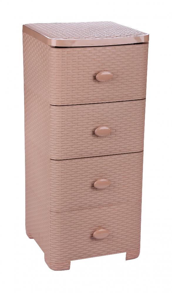 Современный и функциональный комод заслужено пользуется большой популярностью среди наших покупателей. Изделие способно гармонично вписаться в интерьер любой комнаты.Комод произведен из высококачественного и безопасного полипропилена. При производстве используется только сертифицированное и экологически чистое, качественное сырье отечественных и зарубежных производителей. Данное изделие произведено на современном технологичном оборудовании, а потому отличается прочностью и устойчивостью разнообразным механическим воздействиям. Также особую прочность изделию придает цельная конструкция перегородок. Оригинальный внешний вид задает плетёная конструкция поверхности. Комод имеет четыре выдвижных ящика большой вместимости, в которых будет очень удобно хранить личные вещи и другие принадлежности. Благодаря небольшому весу, комод очень легко передвигается. Комод упаковывается в индивидуальную упаковку, где каждый клиент сможет найти инструкцию по сборке. Комод на ножках, колесики отсутствуют.