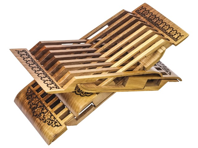 Выполнено из благородного сорта грецкого ореха. Древисину сушат от 5 до 6 лет при определенных условиях. Раздвижная крестообразная подставка для книг, традиционно используется под Коран - называется "лаух", и у нее богатая история. В старину такие подставки можно было увидеть в восточных дворцах и мечетях, они имелись у священнослужителей, учителей, судей, ученых, поэтов и состоятельных купцов.