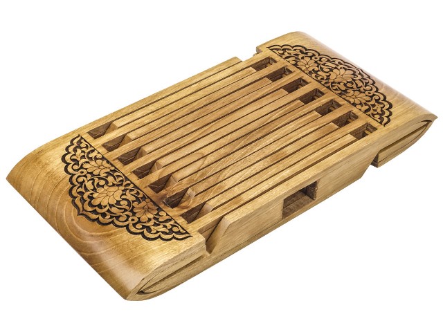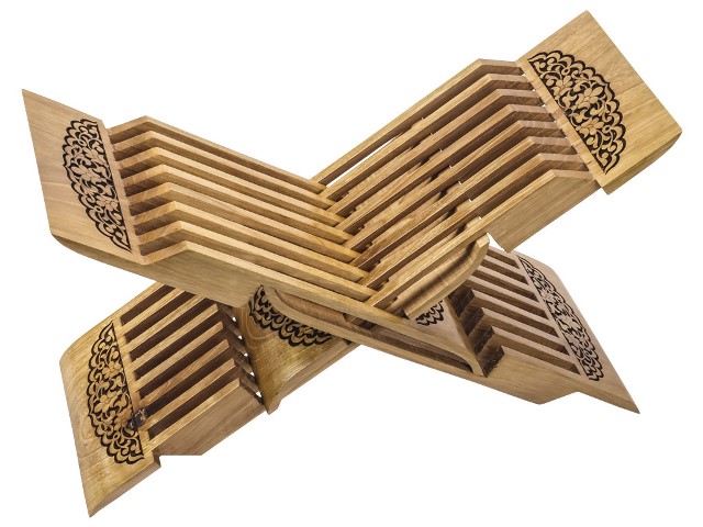 Выполнено из благородного сорта грецкого ореха. Древисину сушат от 5 до 6 лет при определенных условиях. Раздвижная крестообразная подставка для книг, традиционно используется под Коран - называется "лаух", и у нее богатая история. В старину такие подставки можно было увидеть в восточных дворцах и мечетях, они имелись у священнослужителей, учителей, судей, ученых, поэтов и состоятельных купцов.